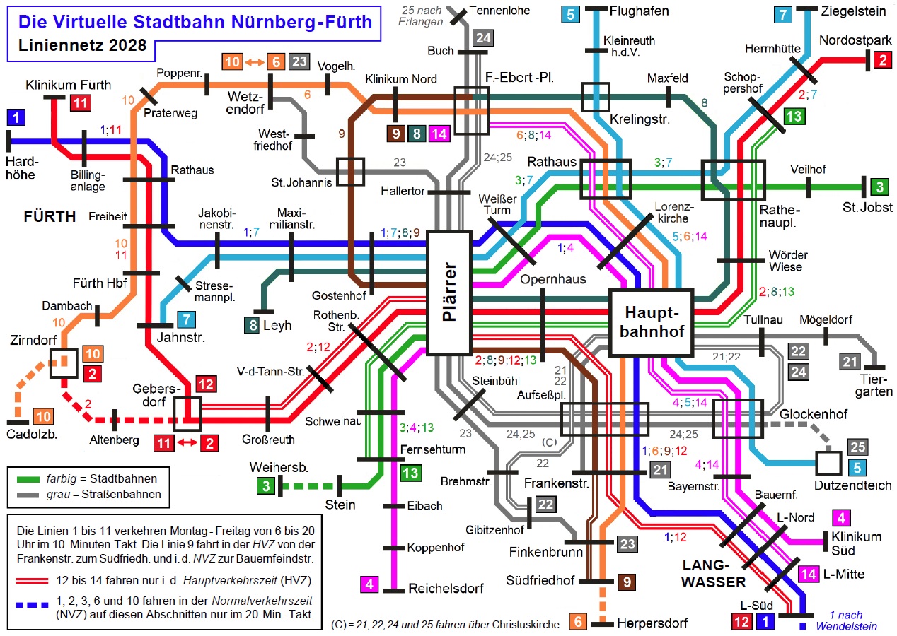 Die Linie 9 befährt zwischen Nordklinikum und Gostenhof Gleise, die in der realen Welt 1976 stillgelegt und durch die Buslinie 34 ersetzt wurden. Vor allem die Besucher des Klinikums waren nie glücklich über die Umsteige-zwänge, die dadurch entstanden. Die Verlängerung der 6 nach Schniegling bringt der 9 durch Umsteiger zum Plärrer am Nordklinikum viele neue Fahrgäste. Daher lohnt sich der Bau eines Tunnels als Ersatz für die enge Fahrt durch die Brückenstraße. Am Friedrich-Ebert-Platz gehen die Linien 8 und 9 ineinander über, damit noch mehr Direktverbindungen entstehen, z.B. vom Maxfeld zum Plärrer und vom Rathenauplatz nach St.Johannis. Die Linien 10 und 11 dienen dem Stadt- und Umlandverkehr in Fürth, Einzel-heiten dazu findet man auf den Detailseiten dazu. |